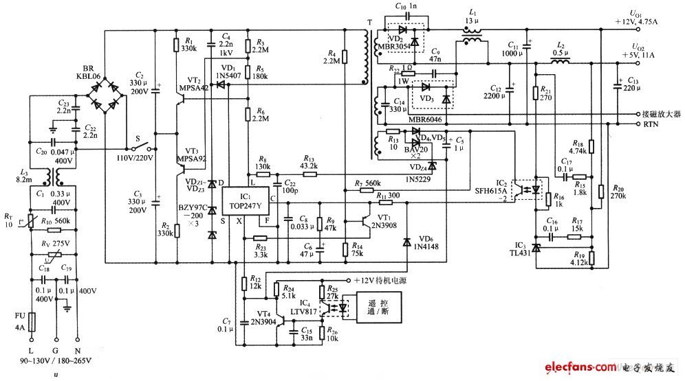 由單片開關(guān)電源集成電路TOP247Y構(gòu)成145W多路輸出式PC開關(guān)電源的主電路如圖5所示。交流輸入電壓范圍是90~1 30V(典型值為110V)或180~265V(典型值為220V)。3路輸出分別為UO1(+1 2V,4.75A);UO2(+5V,1 1A),UO3(+3.3V,10A)。為了能與AT電源兼容,高頻變壓器并沒(méi)有專門的+3.3V繞組,而是利用5V繞組電壓,通過(guò)外部磁放大器電路獲得+3.3V輸出,這樣可簡(jiǎn)化高頻變壓器的設(shè)計(jì)。利用磁放大器還能進(jìn)一步提高了穩(wěn)壓性能。總輸出功率為145W,峰值輸出功率可達(dá)160W。增加了遙控通/斷電路,能遠(yuǎn)程控制開關(guān)電源的通、斷狀態(tài)。其電源效率η≥71%。當(dāng)輸入功率僅為0.91W時(shí),輸出功率可達(dá)0.5W,其功耗僅為0.41W,符合在這種情況下電源功耗不得超過(guò)1W的規(guī)定。S為110V/220V交流輸入電壓選擇開關(guān)。利用晶體管VT2、VT3、電阻R1、R2、R3、R5和R6來(lái)代替均衡電阻,構(gòu)成濾波電容C2、C3的均壓電路。