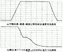 還有些機(jī)器數(shù)需要按位設(shè)置,如SP097,該參數(shù)按2進(jìn)制共有16位,從第0位到第F位,其中第1位與第0位的組合表示準(zhǔn)停旋轉(zhuǎn)方向,置01選擇正方向準(zhǔn)停;第3位置1表示準(zhǔn)停伺服期間主軸鎖定;第5位選擇編碼器檢測(cè)極性,置0;如其余位暫置為0,則SP097=0009H。參數(shù)整定后的加工中心主軸速度實(shí)測(cè)曲線如圖4所示。圖4a為主軸加速-穩(wěn)速(至1000r/min)-減速過(guò)程的動(dòng)態(tài)速度變化曲線,速度上升時(shí)間約為0.2s,超調(diào)量小于0.25%;圖4b為主軸從1000r/min的穩(wěn)定速度作定角度停止時(shí)的動(dòng)態(tài)速度變化曲線,曲線中間的恒速段為位置回路控制速度,標(biāo)志著主軸從速度控制模式變?yōu)槲恢每刂颇J?,主軸在正常運(yùn)行速度下從準(zhǔn)停命令發(fā)出至準(zhǔn)停定位完畢約需要0.5s,過(guò)渡過(guò)程平穩(wěn)。主軸靜態(tài)性能為調(diào)速范圍達(dá)到3000∶10,無(wú)靜差。