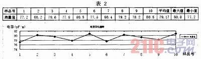 利用同軸電纜芯線電容測量裝置,測量型號為50-5芯線,各時段樣品的測量結(jié)果及變化曲線見表2。只要在數(shù)據(jù)表(電子版)中輸入數(shù)據(jù),就會自動繪制曲線。該圖表可以監(jiān)視芯線電容的變化情況。