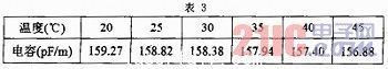 不同絕緣材料的電纜芯線,其電容隨溫度變化而改變。例如如表3所示。