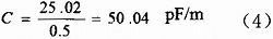 設(shè)樣品浸入水中的長度為500mm,電容測試儀顯示值為25.02pF,就可以測得單位長度電容為: