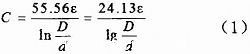 式中:C為電纜單位長度電容(pF/m);ε為絕緣介質(zhì)的相對介電常數(shù);D為電纜的外導(dǎo)體內(nèi)徑即絕緣層外徑(mm);d為電纜的內(nèi)導(dǎo)體外徑(mm)。