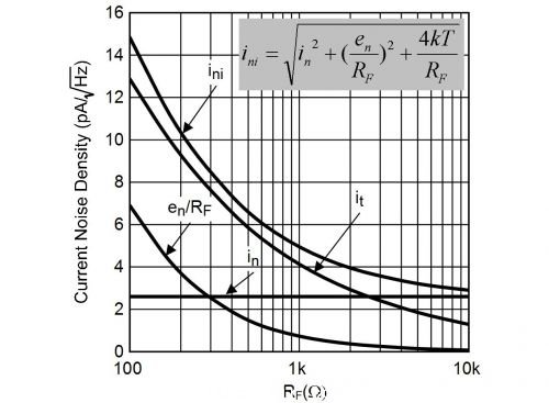 為了保證壓擺率和帶寬(小信號和大信號)的最大化,在這個(gè)例子里面,COMP引腳是接到VCC的??色@得的帶寬跟放大器GBWP有直接的關(guān)系,與跨阻抗增益(RF)和光電二極管內(nèi)的寄生電容成反比。對于給定的放大器需要一個(gè)反饋電阻(RF),要確定這個(gè)反饋電阻有一個(gè)較為簡單的方法,如圖2的曲線所示,在使用了LMH6629的情況下,總等效輸入電流噪聲密度“ini”曲線是剛好與RF成反比的。在這個(gè)曲線里,“in”是LMH6629輸入噪音電流,“en”是LMH6629輸入噪音電壓,“k”是波爾茲曼常數(shù),而“T”是用ºC表示的絕對溫度值。