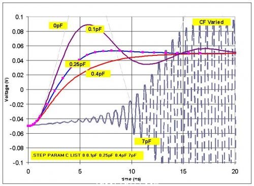 找到最優(yōu)CF值后,可以重新查看初始的閉環(huán)配置(沒有大的電感和電容加入到LG和NG的研究中),在使用最優(yōu)的CF值(此時(shí)是0.25pF)情況下可以得到階躍響應(yīng)。圖8示意了不同的CF曲線,證實(shí)了CF值不管偏大或者偏小都會造成電路的不穩(wěn)定。同時(shí),在額定振鈴的情況下,最優(yōu)CF值帶來了非常好的階躍響應(yīng),此時(shí)可能有一個(gè)更長的振鈴和穩(wěn)定時(shí)間。顯然,不管是0pF還是7pF,電路都是完全的不穩(wěn)定狀態(tài)。正如圖6所預(yù)測的,因?yàn)?pF的噪音增益和放大器開放環(huán)路增益曲線間截距頻率更高,因此,其振蕩頻率高于0pF的振蕩頻率。