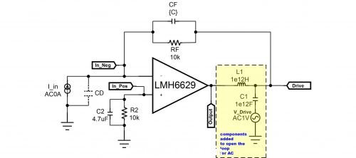 是什么使得一個(gè)看起來很簡單的電路的穩(wěn)定性分析變得如此復(fù)雜呢?主要原因是寄生元件的影響。圖1的電路,幾乎沒有跡象表明這個(gè)電路會是不穩(wěn)定的,圖中所示的寄生元件“CD”是光電二極管固有的電容,可以按照光電二極管的位置和靈敏度來標(biāo)定大小。R2是被用來消除LMH6629的輸入偏置電流產(chǎn)生的偏移誤差,同時(shí)C2消除了R2的噪音。
