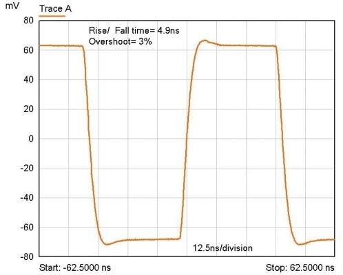 圖10和圖11顯示的是結(jié)果頻率和在輸出端分別使用50?源和負(fù)載端子時(shí)的階躍響應(yīng)。如圖所示,-3dB帶寬時(shí),頻率接近70MHz,沒有峰值。階躍響應(yīng)曲線在上升階段和下降階段與頻率響應(yīng)相匹配,從中可以看到過沖最小化了,沒有振鈴,從而可以確認(rèn)電路已經(jīng)獲得了恰當(dāng)補(bǔ)償。為了對仿真觀察進(jìn)一步核實(shí),實(shí)驗(yàn)臺測試檢測了在沒有補(bǔ)償電容時(shí)的峰值及直接經(jīng)過RF時(shí)10pF電容產(chǎn)生的全上升振蕩。