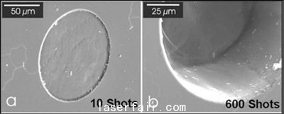 圖2. 鉆石經(jīng)193nm準(zhǔn)分子激光燒蝕形成的凹坑:左圖為10個激光脈沖情況,右圖為600個激光脈沖情況。凹坑的平整度表明了準(zhǔn)分子激光光束在整個照明區(qū)域具有極高的均勻性。