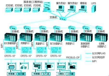 汽車總裝生產(chǎn)線控制系統(tǒng)比較復(fù)雜,因此將整個(gè)總裝線分為7條分線來分別控制,即:bdc存儲(chǔ)線、內(nèi)飾線、門線、底盤線、發(fā)動(dòng)機(jī)線、儀表線、終裝終檢線。各線的plc程序可獨(dú)立運(yùn)行互相之間有聯(lián)鎖信號(hào)。