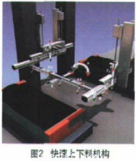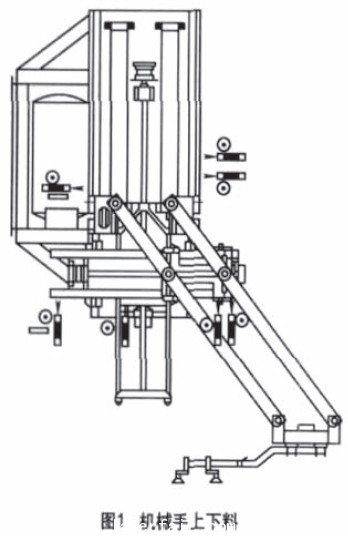 機(jī)械手上下料的自動(dòng)化機(jī)構(gòu)(見圖1)一般包含拆垛裝置、對(duì)中裝置、上料機(jī)械手、下料機(jī)械手、穿梭小車等部分。其中上下料機(jī)械手和穿梭小車一般包含2~3個(gè)運(yùn)動(dòng)軸,由伺服電動(dòng)機(jī)驅(qū)動(dòng)。世界上生產(chǎn)機(jī)械手的廠家有美國的I S I、日本的小矢部、瑞典的A B B和臺(tái)灣的金峰等。