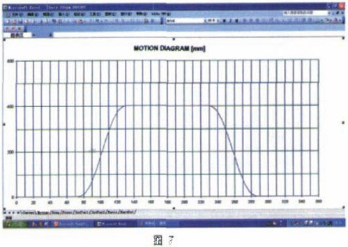 圖5~圖7所示為通過軟件制作的運(yùn)動(dòng)曲線,曲線中的橫坐標(biāo)為主軸角度,縱坐標(biāo)為從軸位置,通過不同的同步曲線實(shí)現(xiàn)了送料機(jī)構(gòu)各個(gè)運(yùn)動(dòng)方向與壓力機(jī)的可編程運(yùn)動(dòng)控制。圖5為一條從軸不跟隨主軸運(yùn)動(dòng)的同步曲線,圖6為一條從軸跟隨主軸做先加速后勻速再減速的五次方運(yùn)動(dòng)曲線,圖5與圖6的可編程組合實(shí)現(xiàn)了圖7所示完整的同步運(yùn)動(dòng)。這條曲線就是#p#分頁標(biāo)題#e#VX,VY等與M之間同步運(yùn)動(dòng)所需要的曲線,為X、V Y、V Z、V A、V B分別編制的同步曲線如圖8所示。