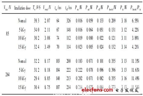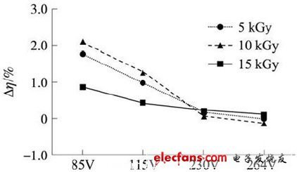從圖3 中可以看到, 在較低的交流輸入電壓(如85 V和115 V )下, 使用輻照后的APT13003E比使用未輻照的APT13003E 系統(tǒng)效率都有所提高, 而在較高交流輸入電壓下(如230 V 和264 V ), 輻照后的APT13003E 未能使系統(tǒng)效率提高。在85 V 交流輸入電壓下, 輻照劑量為10 kGy 的APT13003E的性能最好, 開關(guān)晶體管的總損耗由0. 209W 降低到0. 121W, 降低了42% , 使得系統(tǒng)整體效率提高了2. 1% , 若該開關(guān)晶體管采用TO - 92封裝, 這將使開關(guān)晶體管的結(jié)溫降低約11 ℃ ; 在115 V交流電壓下, 系統(tǒng)的整體效率也提高了約1. 4%, 開關(guān)晶體管的結(jié)溫將降低約7℃, 這就有效地提高開關(guān)晶體管的可靠性, 降低了開關(guān)電源的損耗。