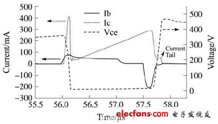 而在264 V輸入電壓下, 輻照后關(guān)斷損耗只有較小幅度的減小, 因此總損耗基本不變, 系統(tǒng)效率也沒有改善。如圖4 和圖5 分別為未經(jīng)輻照的APT13003E 在85 V 和264 V輸入電壓下基極電流、集電極電壓和電流的波形。比較圖4和圖5中可以看出, 在264 V 輸入電壓條件下導(dǎo)通時(shí)集電極電流的尖峰比起85 V 時(shí)要大很多, 這是因?yàn)閷?dǎo)通時(shí)變壓器寄生電容充電電壓增大了2. 1倍, 但充電時(shí)間只增加了約0. 6倍, 所以充電電流就會(huì)大大增加, 這也導(dǎo)致了APT13003E 的導(dǎo)通損耗由85 V 下的0. 016W 變?yōu)?64 V下的0. 183W, 此時(shí)導(dǎo)通損耗占了總的損耗的大部分, 而電子輻照對(duì)導(dǎo)通損耗并沒有改善; 另一方面, 在APT13003E 關(guān)斷時(shí), 集電極電壓并沒有直接降到0, 而是先經(jīng)過一個(gè)近100 ns的電流“ 尾巴”之后, 才又下降到0, 此時(shí)集電極電壓已經(jīng)比較大了, 因此這個(gè)電流“尾巴”所造成的損耗占關(guān)斷損耗的比例較大。產(chǎn)生這個(gè)“尾巴”的原因是, 關(guān)斷開關(guān)晶體管時(shí), 由于管子的基區(qū)比較薄, 過大的基極電流引起較大的基區(qū)電位差, 使VBE 為負(fù)的情況下發(fā)射結(jié)局部正向偏置, 集電極電流遲遲降不下來。