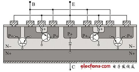 采用鉗位型開關(guān)晶體管也能降低開關(guān)晶體管的關(guān)斷延時(shí), 其原理是通過鉗位電路使VBC在晶體管導(dǎo)通時(shí)不能增加到深飽和所需的0. 7 V, 這樣注入集電結(jié)兩側(cè)的少子很少, 使超量?jī)?chǔ)存電荷很少, 這樣儲(chǔ)存時(shí)間大大縮短。采用鉗位型開關(guān)晶體管主要有兩種, 一種是在集電結(jié)并聯(lián)肖特基二極管的晶體管,由于在高溫下漏電電流較大, 其ts - Vcesat的Trade??o ff關(guān)系最差, 目前應(yīng)用較少。另一種是橫向PNP鉗位型晶體管, 其結(jié)構(gòu)圖如圖6所示, 它在高溫下漏電較小, 能得到較好的Trade-off關(guān)系,電流放大系數(shù)基本不變, 目前得到了越來越多的應(yīng)用, 如吉林華微電子股份有限公司研發(fā)的產(chǎn)品3DD13003A 就采用了這種結(jié)構(gòu)。
