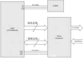 圖1為此系統(tǒng)的結(jié)構(gòu)連接框圖。如圖所示,ARM芯片與FPGA芯片之間通過數(shù)據(jù)總線、地址總線及讀寫控制線相連,而與終端PC則通過串口通信;FPGA與目標(biāo)設(shè)備通過命令控制總線和故障檢測總線相連。
