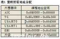 由于重映射主要是用于Flash和片內(nèi)RAM的地址空間交換,所以片內(nèi)外圍接口(EBI、USART、TC)對應(yīng)的存儲器編程地址范圍在映射前后不發(fā)生改變,而訪問外設(shè)地址為重映射后所分配。重映射后地址分配如表1所示。