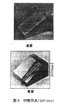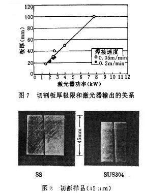 圖7示出切割板厚極限和激光輸出的關(guān)系。對(duì)0.05m/min及0.2m/min的切割速度進(jìn)行了研究。從研究結(jié)果中可以看出,切割100mm的厚板時(shí)目前需要7~8kW的激光輸出。圖8示出用3.8kW切割厚45mm的碳鋼和SUS304所得到的切割剖面。從圖中可以看出,可進(jìn)行彎曲幅度在2mm以下的高質(zhì)量分離切割。圖9示出板厚100mm時(shí)的圓錐狀樣品的切割結(jié)果。因此,如果板增厚,不可避免地會(huì)增大切割彎曲幅度。今后,應(yīng)該研究通過改進(jìn)光學(xué)系統(tǒng)及切割氣體的流向來提高切割質(zhì)量。