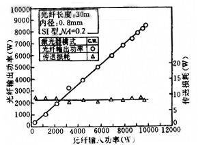 圖1示出采用30m光纖傳送l0kWYAG激光時(shí)的光束傳送特性。從圖中可以看出,入射功率10kW時(shí)傳送損失約800,大部分傳送損失都是由光纖端面的反射引起的。采用YAG激光器時(shí),反射光近800W,這種處理很重要。采用該系統(tǒng)時(shí),處處都要注意不要因反射光而使系統(tǒng)本身受到損傷。