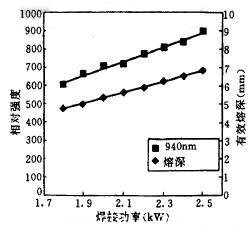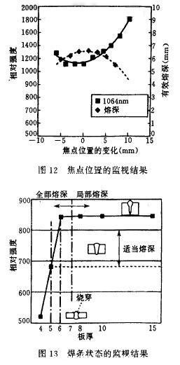 圖11示出焊接輸出的監(jiān)視結(jié)果與熔深深度的比較。從此結(jié)果中可以看出,熔深深度變化0.4mm時,就可探測到輸出功率100W左右的焊接變化。圖12示出焦點位置和YAG激光器反射光及熔深深度的關(guān)系。這里雖然采用焦點深度Bf=200mm的大透鏡,但是可以探測士4mm的熔深變化。圖13示出穿透和未穿透時的發(fā)光強度變化。穿透焊接時,因為熔融金屬在板內(nèi)穿過,所以發(fā)光強度下降,于是就能探測到可以獲得穩(wěn)定的內(nèi)部波焊道的狀態(tài)。