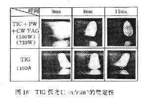 對這一過程中的TIG弧光和YAG激光光束的相互作用進行了研究,研究結(jié)果認(rèn)為弧光及光圈光束吸收可以忽略。圖16示出高速混合焊接時的弧光穩(wěn)定性與僅用TIG焊接的比較結(jié)果。