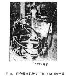 圖15示出同軸TIG-YAG激光焊接頭的外貌。這種焊接方法,是把從光纖射出的光束分開,將TIG焊極設(shè)置在其中央,使光束在TIG焊極頂端下方再次聚光,同軸向同一地方照射聚光光束和TIG弧光,進行焊接。