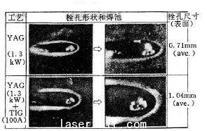 圖17示出相對焊接坡口縫隙余量的同軸TIG-YAG激光焊接的結(jié)果。僅用YAG時焊接坡口縫隙為0.4mm時,會產(chǎn)生咬邊。而同軸TIG-YAG激光焊接時焊接坡口縫隙可達(dá)0.8mm。圖18示出根據(jù)焊接焊道的斷面研究氣孔發(fā)生狀況的結(jié)果。因為保護氣體中使用了Ar,所以僅采用YAG時不可避免在部分焊道中產(chǎn)生氣孔。而同軸TIG-YAG激光焊接可以控制氣孔的發(fā)生,如圖19所示,這是因為同軸TIG-YAG激光焊接比單用YAG時栓孔上部的孔徑大,金屬蒸汽容易排出。