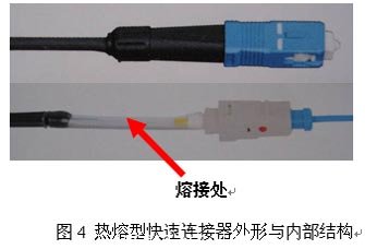 熱熔型快速連接器,如下圖4,實(shí)際上一樣是光纖熔接,只不過(guò)熔接點(diǎn)在連接器尾端內(nèi)部,相當(dāng)于熱熔把尾纖的尾纜給省掉了,這樣做的好處是熔接好后,不需作額外保護(hù)。
