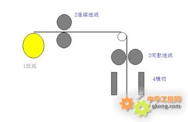 如圖2所示, 4為模切,主動(dòng)軸為編碼器安裝在模切軸上,由變頻器帶動(dòng)機(jī)械凸輪結(jié)構(gòu)完成模切塊的開合,對間歇送模軸送進(jìn)來的紙板進(jìn)行模切,要求必須在模切快打開時(shí),間歇軸快速精確送出一定長度的紙板。連續(xù)送紙是放紙1機(jī)構(gòu)為被動(dòng)的電磁離合器控制張力,必須連續(xù)送紙才能保證拉動(dòng)放紙機(jī)構(gòu),控制要點(diǎn)是要求必須在模切打開時(shí)開始送設(shè)定長度的紙,在閉合沖上之前要精確到位。連續(xù)送紙要求主要是主軸模切軸走一周期,勻速送出設(shè)定長度的紙。圖2 模切機(jī)工藝示意圖