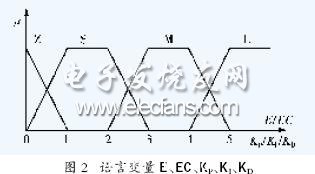 DC轅AC逆變電源控制的主要是輸出電壓及頻率的準(zhǔn)確性。頻率的準(zhǔn)確性由PWM發(fā)生器決定(它是一個(gè)存貯在存儲(chǔ)器內(nèi)的一個(gè)正弦輸出表格),只要觸發(fā)計(jì)算準(zhǔn)確就能達(dá)到設(shè)計(jì)要求。負(fù)載的變化使輸出電流產(chǎn)生變化,對(duì)于一定脈寬輸出的DC轅AC電源來說,勢(shì)必導(dǎo)致輸出電壓的變化。因此采用模糊控制規(guī)則根據(jù)不同的渣e渣和渣ec渣,對(duì)PID控制器的參數(shù)kp、ki、kd進(jìn)行在線自整定來調(diào)節(jié)輸出電壓。模糊控制器的輸入變量是偏差絕對(duì)值渣E渣、偏差變化率絕對(duì)值渣EC渣,