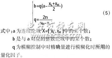 在本文中利用CRI法推理時(shí),控制過程是用查控制表來產(chǎn)生控制量的,在控制表中,模糊偏差量渣E渣、模糊偏差變化率渣EC渣,PID控制器的模糊比例增益系數(shù)KP、模糊積分增益系數(shù)KI和模糊微分增益系數(shù)KD都是用其對(duì)應(yīng)整數(shù)論域的元素來表示的。對(duì)于單個(gè)實(shí)時(shí)精確量利用式(5),得到的結(jié)果再四舍五入,就求出了對(duì)應(yīng)整數(shù)論域的相應(yīng)元素,從而實(shí)現(xiàn)了輸入量的模糊化。