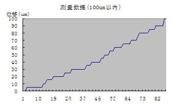 實驗中物體的移動是通過牽引顯微鏡物鏡下的細絲而產(chǎn)生的,因此細絲位移就是物體的位移。為了獲得100um的位移,我們將物體放在一個螺旋測微器控制的光學(xué)平臺上。螺旋測微器總共50個小格,轉(zhuǎn)動一周移動為0.5mm,因此轉(zhuǎn)動一小格為10um。通過調(diào)節(jié)螺旋測微器,我們獲得100um的位移范圍。測量時,將采集到的數(shù)據(jù)實時保存到電腦中,再通過畫圖軟件顯示。圖5是測量的實驗結(jié)果。圖中的橫坐標表示測量的時間,縱坐標表示測量的位移,平直部分是移動螺旋測微器時的停留時間。由于是手旋動螺旋測微器,因此移動的快慢不一致導(dǎo)致出現(xiàn)階梯狀的停頓。