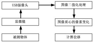 通過讀數(shù)顯微鏡的放大作用把物體發(fā)生的微小位移放大,利用攝像頭拍攝物體放大的圖像,用計算機對圖像進行二值化處理,通過移動前后圖像質(zhì)心位置像素點的變化可計算出物體位移的變化。圖1是實驗原理和測量流程圖。