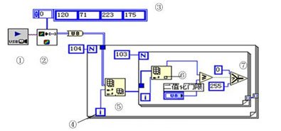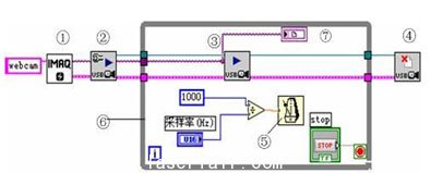 在LabVIEW 中,由于將調(diào)用函數(shù)模塊化了,因此調(diào)用USB攝像頭非常簡單。圖3是LabVIEW調(diào)用USB攝像頭采集圖像的編程。調(diào)用的過程如下:調(diào)用攝像頭①IMAQ Create.vi —> ②IMAQ USB Grab Setup.vi —> ③IMAQ USB Grab Acquire.vi —>④IMAQ USB Close.vi,該過程為靜態(tài)拍攝一幀。加上一個循環(huán)⑥While Loop,通過⑤Wait Until Next ms Multiple控制While Loop每隔多少毫秒觸發(fā)一次(默認值為33.3毫秒,也就是每秒三十30幀),輸出⑦Image Display。