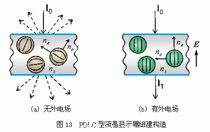 3. “高分子散布型液晶顯示器”(Polymer dispersed liquid crystal liquid crystal display),簡稱“PDLC型液晶顯示器”。這種顯示器的液晶組件構(gòu)造如圖13所示。高分子的單體(monomer)與液晶混合后夾在兩片玻璃中間,做成一液晶盒。這種玻璃與上面所用的相同,是表面上先鍍有一層透明而導(dǎo)電的薄膜作電極。但是不需要在玻璃上鍍表面配向劑。此時(shí)將液晶盒放在紫外燈下照射使個(gè)單體連結(jié)成高分子聚合物。在高分子形成的同時(shí),液晶與高分子分開而形成許多液晶小顆粒。這些小顆粒被高分子聚合物固定住。 當(dāng)光照射在此液晶盒上,因折射率不同,而在顆粒表面處產(chǎn)生折射及反射。經(jīng)過多次反射與折射,就產(chǎn)生了散射(scattering)。此液晶盒就像牛奶一樣呈現(xiàn)出不透明的乳白色。