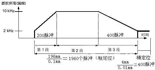 工業(yè)機(jī)床控制在工業(yè)自動(dòng)化控制中占有重要位置,定位鉆孔是常用工步。設(shè)刀具或工作臺(tái)欲從A點(diǎn)移至C點(diǎn),已知AC=200mm,把AC劃分為AB與BC 兩段,AB=196mm,BC=4mm,AB段為粗定位行程,采用0.1mm/步的脈沖當(dāng)量依據(jù)直線升降頻規(guī)律快速移動(dòng),BC段為精定位行程,采用 0.01mm/步的脈沖當(dāng)量,以B點(diǎn)的低頻恒速運(yùn)動(dòng)完成精確定位。在粗定位結(jié)束進(jìn)入精定位的同時(shí),PLC自動(dòng)實(shí)現(xiàn)變速機(jī)構(gòu)的更換。