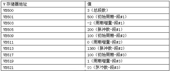 利用這個(gè)公式,加速部分(第1段)周期增量為2,減速部分(第3段)周期增量為1。因第2段是恒速部分,故周期增量為0。如果PTO的包絡(luò)表從VB500開始存放,則表1為上例的包絡(luò)表值。