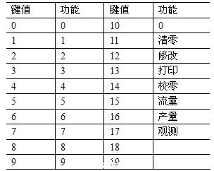HD7279A的鍵值分布為:右邊數(shù)第一列為0-7,第二列為8-15,依次類推,本設(shè)計(jì)中由于共用到20個(gè)鍵,故使用了從右下角開始的S0-S1920個(gè)鍵,其鍵值與按鍵的對(duì)應(yīng)關(guān)系如表1所示。