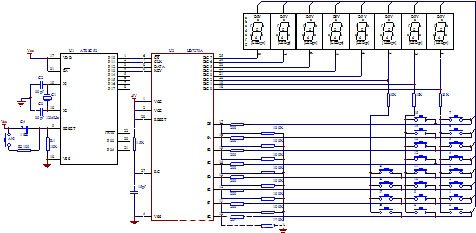 采用HD7279A設(shè)計(jì)的鍵盤顯示硬件電路連接圖如圖1所示。圖1中8個(gè)鍵盤上拉電阻取10KΩ,8個(gè)位限流電阻取為20Ω,8個(gè)下拉電阻取100KΩ,HD7279A工作時(shí)需要外接的RC振蕩電路以供系統(tǒng)工作,其典型值分別為R=1.5KΩ,C=15pf,如果芯片無法正常工作,請(qǐng)首先檢查此振蕩電路且在進(jìn)行印制電路板布線時(shí),所有元件,尤其是振蕩電路的元件應(yīng)盡靠近HD7279A并盡量使電路連線最短。 HD7279A的RESET復(fù)位端在一般應(yīng)用情況下,可以直接與正電源連接,在需要較高可靠性的情況下可以連接外部的復(fù)位電路,能直接由CPU控制在上電或RESET端由低電平變?yōu)楦唠娖胶螅琀D7279A大約需要經(jīng)過18-25Ms的時(shí)間才會(huì)進(jìn)入到正常工作狀態(tài)。