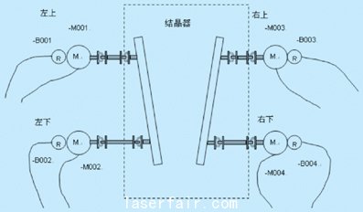 結(jié)晶器調(diào)寬系統(tǒng)包括:4套絲杠機(jī)構(gòu),每個(gè)窄面2套;4套帶有旋轉(zhuǎn)變壓器的交流異步伺服電動(dòng)機(jī),固定在澆注平臺(tái)下的冷卻室外;4個(gè)萬(wàn)向軸、4套交流伺服控制單元。結(jié)晶器調(diào)寬窄面控制機(jī)械結(jié)構(gòu),如圖1所示。每一個(gè)窄面使用伺服單元控制調(diào)寬電機(jī)驅(qū)動(dòng),可以改變兩邊寬度和每個(gè)面的錐度。由于調(diào)寬時(shí)生產(chǎn)的板坯窄面不是直的,這意味著在調(diào)寬期間窄面銅板與坯殼之間的氣隙的產(chǎn)生,避免漏鋼,在調(diào)整寬度的同時(shí)必須調(diào)整錐度。為了減小凝固坯殼的應(yīng)力,窄面的調(diào)整應(yīng)緩慢進(jìn)行。為保證坯殼與銅板緊密接觸,結(jié)晶器錐度隨寬度的減小而減小,隨寬度增加而加大??刂葡到y(tǒng)根據(jù)鋼種、澆注速度、要求的錐度和板坯定尺,在澆注期間為各邊的運(yùn)動(dòng)選擇不同的算法。