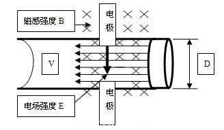 當(dāng)流體在管道內(nèi)流動經(jīng)過一橫向磁場B的時候,相當(dāng)于有一定電導(dǎo)率的導(dǎo)體在切割磁力線,形成動生電動勢和感生電流,通過管道徑向兩電極可以引出該電動勢E,其大小與磁場B、流速V和管徑D成正比,即: