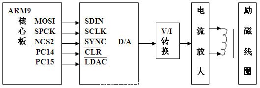電磁流量儀表的勵磁電路的任務(wù)是向勵磁線圈提供一穩(wěn)定的驅(qū)動電流。電流波形為方波、三值方波和梯形波等形式,波形變化的目的是結(jié)合信號處理電路,分析在不同勵磁方式下電磁流量儀表的精確度、零點穩(wěn)定性和抗干擾能力等多項指標(biāo)。為研制高精度電磁流量計作探索性研究。該電路由核心板的SPI2 口輸出數(shù)字量,經(jīng)過 D/ A 轉(zhuǎn)換形成模擬信號,經(jīng)V/I轉(zhuǎn)換激勵和帶有電流負反饋的電流放大器輸出,適合各種勵磁波形的變化。結(jié)構(gòu)框圖如圖 4所示。D / A 轉(zhuǎn)換電路采用 AD7243 芯片,實現(xiàn) 12 位的 SPI同步串行輸入 , - 5~ + 5 V 的雙極性輸出。與 ARM9 核心板的 SPI2口對接,如圖4所示。