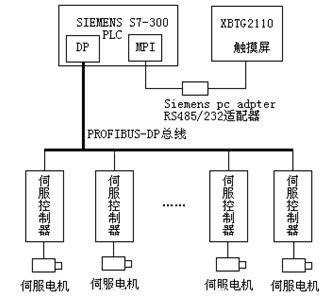 上位機由西門子的S7-300PLC組成,型號為6ES7315-2AG10-0AB0,它有一個專門的PROFIBUS-DP接口,一個MPI通信接口,可接入64個從站。PROFIBUS-DP總線負責對整個系統(tǒng)的中的所有伺服控制器進行管理,包括速度、力矩、位置等參數(shù)的命令傳送與設置等。作為一個窗口,由組態(tài)軟件ProTool編織的人機界面可方便的對整個控制系統(tǒng)進行監(jiān)視和參數(shù)的修改。