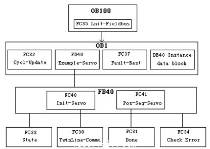OB1是主程序組織塊,包括功能FC32、功能塊FB40、功能FC37和背景數(shù)據(jù)塊DB40。FC32即CYCL_UPDATE,它的功能是定期的讀和更新來自總線上的背景數(shù)據(jù)塊的數(shù)據(jù)。功能塊FB40是控制伺服控制器的主要程序塊,它將完成伺服控制器的初始化和位置控制,主要包括功能FC40和功能FC41。FC40即INIT_SERVO,它主要完成多個軸的初始化即多個伺服控制器的初始化。FC41即POS_SEQ_SERVO,它是整個伺服控制的核心部分,一些控制命令如速度命令、位置命令、力矩命令、原點復歸命令以及從總線上讀取伺服控制器的反饋值等都是由它完成的。FC37即FAULT_RESET,它是復位模塊,清除總線的錯誤信息并產(chǎn)生一個復位命令使伺服控制器重新復位。DB40是功能塊FB40的背景數(shù)據(jù)快。