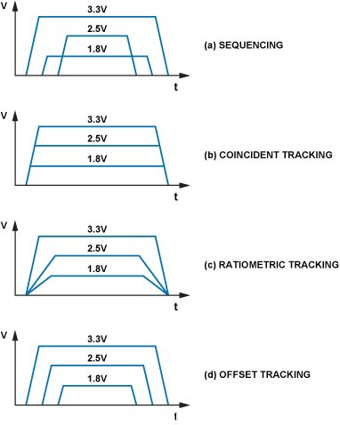 所謂電源時序控制,是指以指定順序開關(guān)電源。電源時序控制可以簡單地基于既定的時間順序,或者一個電源的開啟時間取決于另一個電源何時達(dá)到設(shè)定的閾值。電源跟蹤基于這樣一個事實:電源電壓無法(一般也不應(yīng))瞬間改變。電源系統(tǒng)設(shè)計師可以利用這一特性,有效地控制系統(tǒng)中各電源相對于其它電源的斜率。電源跟蹤分為三類:同步、比率和偏移。圖1中的四幅圖對時序控制、同步跟蹤、比率跟蹤和偏移跟蹤進(jìn)行了比較。