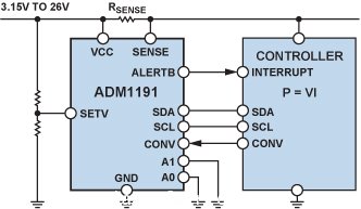 ADM1191通過 I2C 總線與主控制器通信。通過配置A0和A1引腳的邏輯輸入電平,同一系統(tǒng)最多可以支持16個器件的尋址。本地控制器可以將測得的電壓與電流相乘,從而計算電源軌的功耗。發(fā)生過流狀況時,ALERTB信號通過一個中斷快速通知控制器,這個關(guān)于故障狀況的快速報警可以幫助保護(hù)系統(tǒng)免遭損壞。