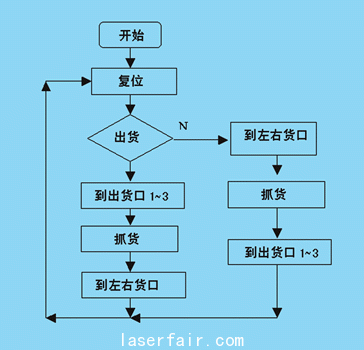 從復(fù)位位置啟動(dòng),根據(jù)要求到相應(yīng)出貨臺(1,2,3號貨臺),此時(shí)底盤轉(zhuǎn)動(dòng)到要求位置,立柱下降,手臂伸出,定位后手抓貨物,立柱上升,同時(shí)手臂回收(以免運(yùn)行中與其它設(shè)備相撞),然后到相應(yīng)出貨臺(左,或右出貨臺),立柱下降,手臂伸出,手打開,把貨物放在相應(yīng)出貨臺上。