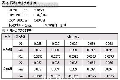 將傾角傳感器放在振動(dòng)臺(tái)上進(jìn)行振動(dòng)試驗(yàn),振動(dòng)試驗(yàn)的技術(shù)條件如表4所示。記錄振動(dòng)試驗(yàn)前后傾角傳感器的零位輸出V0、V180和Vout。其試驗(yàn)數(shù)據(jù)如表5所示。