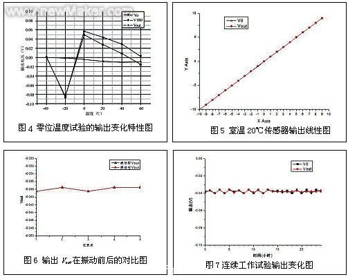 然后對(duì)結(jié)果進(jìn)行修正,用于對(duì)數(shù)據(jù)進(jìn)行分析,修正后的結(jié)果如表2所示??梢缘玫綔囟茸兓?輸出變化特性圖,如圖4所示??梢钥闯?,在低溫-40℃到高溫60℃的溫度范圍內(nèi),內(nèi)部?jī)A角傳感器的輸出V0具有最大為0.135V的溫度靈敏性。而當(dāng)經(jīng)過偏移校正后,傾角傳感器的輸出Vout具有最大為0.01V的溫度靈敏性。也就是說此傾角傳感器的零位溫度系數(shù)小于0.0001°/℃,其調(diào)零精度達(dá)到0.01°,達(dá)到了自動(dòng)調(diào)零的目的,能夠滿足測(cè)試設(shè)備的要求。
