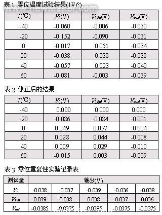 經(jīng)過對(duì)傾角傳感器自動(dòng)調(diào)零原理的研究,設(shè)計(jì)并實(shí)現(xiàn)了自動(dòng)調(diào)零伺服傾角傳感器樣機(jī)。為了驗(yàn)證自動(dòng)調(diào)零伺服傾角傳感器的自動(dòng)調(diào)零和消除漂移特性,對(duì)此傾角傳感器進(jìn)行高低溫試驗(yàn)。其溫度試驗(yàn)結(jié)果如表1所示,其中V0和V180是內(nèi)部?jī)A角傳感器在自動(dòng)調(diào)零校正操作時(shí)在兩個(gè)測(cè)量位置直接讀取的,而Vout是調(diào)零校正后的計(jì)算結(jié)果(下同)。