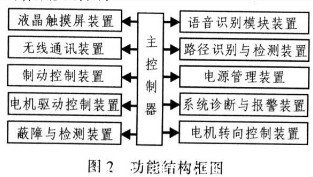 服務機器人控制系統(tǒng)主要用于實現(xiàn)控制服務機器人的導航、啟動、停車、運行控制、路徑規(guī)劃、安全監(jiān)控、遠程控制計算機通訊及語音識別等功能。該控制系統(tǒng)主要由主控、導引、驅動、通訊、安全與輔助、語音識別、液晶觸摸屏以及電源管理等單元組成。圖2為其功能結構框圖。