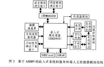 嵌入式處理器是整個硬件系統(tǒng)的核心元件,其性能好壞直接決定整個系統(tǒng)的運行效果,所提供功能的強弱直接決定嵌入式應用的適應范圍和開發(fā)復雜度。嵌入式處理器一般具備以下特點:支持實時多任務操作系統(tǒng);具有強存儲區(qū)保護功能;處理器結構可擴展;功耗低。圖3為基于ARM9的嵌入式系統(tǒng)的服務機器從主控制器模塊結構。